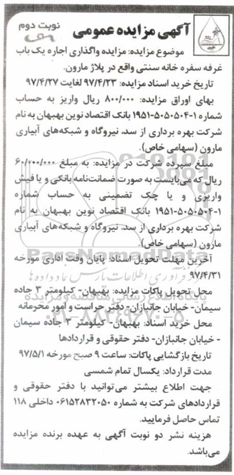 بهای اوراق مزایده 800.000 ریال واریز به حساب شماره 1-5050504-1951 بانک اقتصاد نوین بهبهان به نام شرکت بهره بردرای از سد نیروگاه و شبکه های آبیاری مارون ( سهامی خاص )