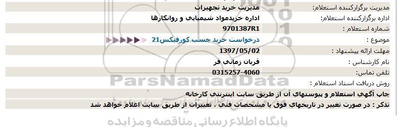 اداره برگزارکننده استعلام: اداره خریدمواد شیمیایی و روانكارها