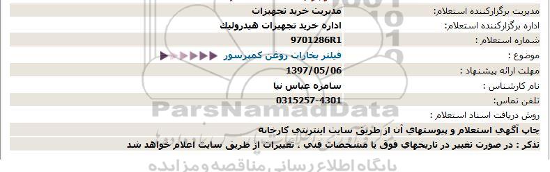 اداره برگزارکننده استعلام اداره خرید تجهیزات هیدرولیک