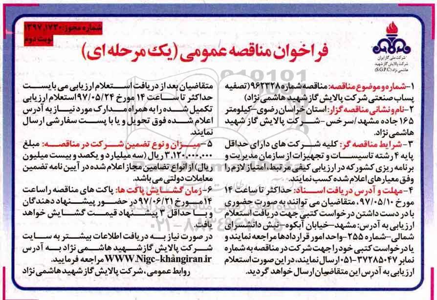 1- شماره و موضوع مناقصه: مناقصه شماره 962328 ( تصفیه پساب صنعتی شرکت پالایش گاز شهید هاشمی نژاد )