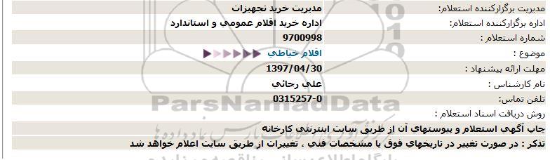 اداره برگزارکننده استعلام : اداره خرید اقلام عمومی و استاندارد