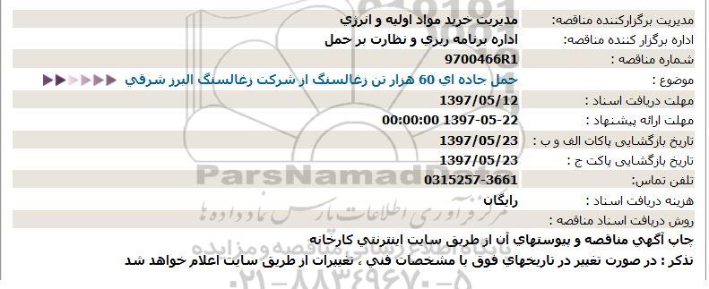 علاقهمندان میتوانند جهت دریافت اسناد و اطلاعات تکمیلی، مناقصه حمل جاده ای 60 هزار تن زغالسنگ با سامانه مناقصات و مزایدات ایران پارسنماد داده ها 88349670 تماس حاصل نمایند.