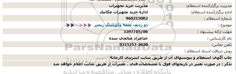استعلام بها و موضوع استعلام استعلام,استعلام دو ردیف حلقه و کوپلینگ زنجیر به اطلاع کلیه شرکتها و افراد متخصص واجد شرایط میرساند، آگهی گذار در نظر دارد از طریق استعلام بها، نسبت به انتخاب و دریافت پیشنهادات اقدام نماید. این استعلام با کد آگهی ثبت شده در سامانه خبرگزاری پارس نماد : 1236772 منتشر شده است. مشخصات استعلام : تاریخ شروع استعلام: 1397/05/01 آخرین مهلت ارسال پیشنهاد قیمت : 1397/05/06 و محل اجرای پروژه : استان اصفهان میباشد. استعلام قیمت مورد درخواست : استعلام,استعلام دو ردیف حلقه و کوپلینگ زنجیر با دستهبندیهای تخصصی و گروه های مرتبط : زنجیر صنعتی, لوله و اتصالات, استعلام اطلاع رسانی میگردد.