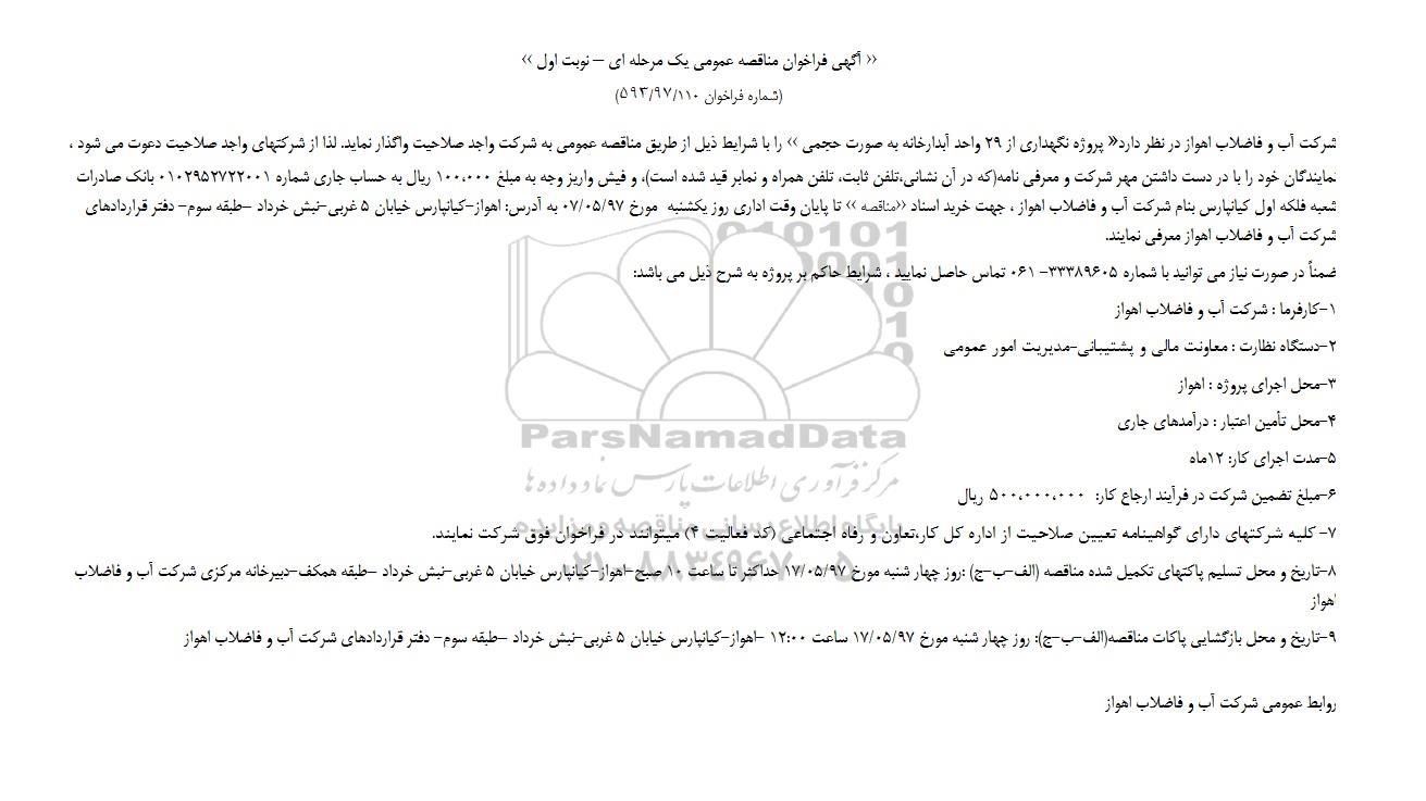 شرکت آب و فاضلاب اهواز در نظر دارد پروژه نگهداری از 29 واحد آبدارخانه به صورت حجمی را با شرایط ذیل از طریق مناقصه عمومی به شرکت واجد صلاحیت واگذار نماید. لذا از شرکتهای واجد صلاحیت دعوت می شود نمایندگان خود را با در دست داشتن مهر شرکت و معرفی نامه که در آن نشانی ، تلفن ثابت ، تلفن همراه و نمابر قید شده است و فیش واریز وجه به مبلغ 100.000 ریال به حساب جاری شماره 0102952722001 بانک صادرات شعبه فلکه اول کیانپارس به نام شرکت آب و فاضلاب اهواز جهت خرید اسناد مناقصه تا پایان وقت اداری روز یکشنبه مورخ 97.5.7 به آدرس اهواز کیانپارس خیابان 5 غربی نبش خرداد طبقه سوم دفتر قراردادهای شرکت معرفی نمایند