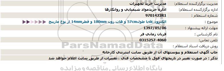 استعلام بها و موضوع استعلام استعلام,استعلام الکترود به اطلاع کلیه شرکتها و افراد متخصص واجد شرایط میرساند، آگهی گذار در نظر دارد از طریق استعلام بها، نسبت به انتخاب و دریافت پیشنهادات اقدام نماید. این استعلام با کد آگهی ثبت شده در سامانه خبرگزاری پارس نماد : 1239762 منتشر شده است. مشخصات استعلام : تاریخ شروع استعلام: 1397/05/03 آخرین مهلت ارسال پیشنهاد قیمت : 1397/05/06 و محل اجرای پروژه : استان اصفهان میباشد. استعلام قیمت مورد درخواست : استعلام,استعلام الکترود با دستهبندیهای تخصصی و گروه های مرتبط : الکترود, استعلام اطلاع رسانی میگردد.