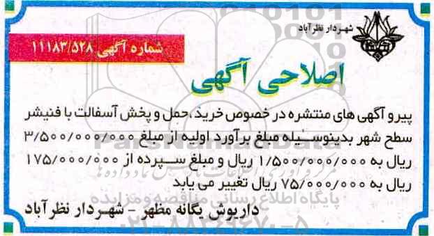 پیرو اگهی منتشره در خصوص خرید ، حمل و پخش آسفالت با فنیشر سطح شهر بدینوسیله مبلغ برآورد اولیه از مبلغ 3.500.000.000 ریال به 1.500.000.000 ریال و مبلغ سپرده از 175.000.000 ریال به 75.000.000 ریال تغییر می یابد