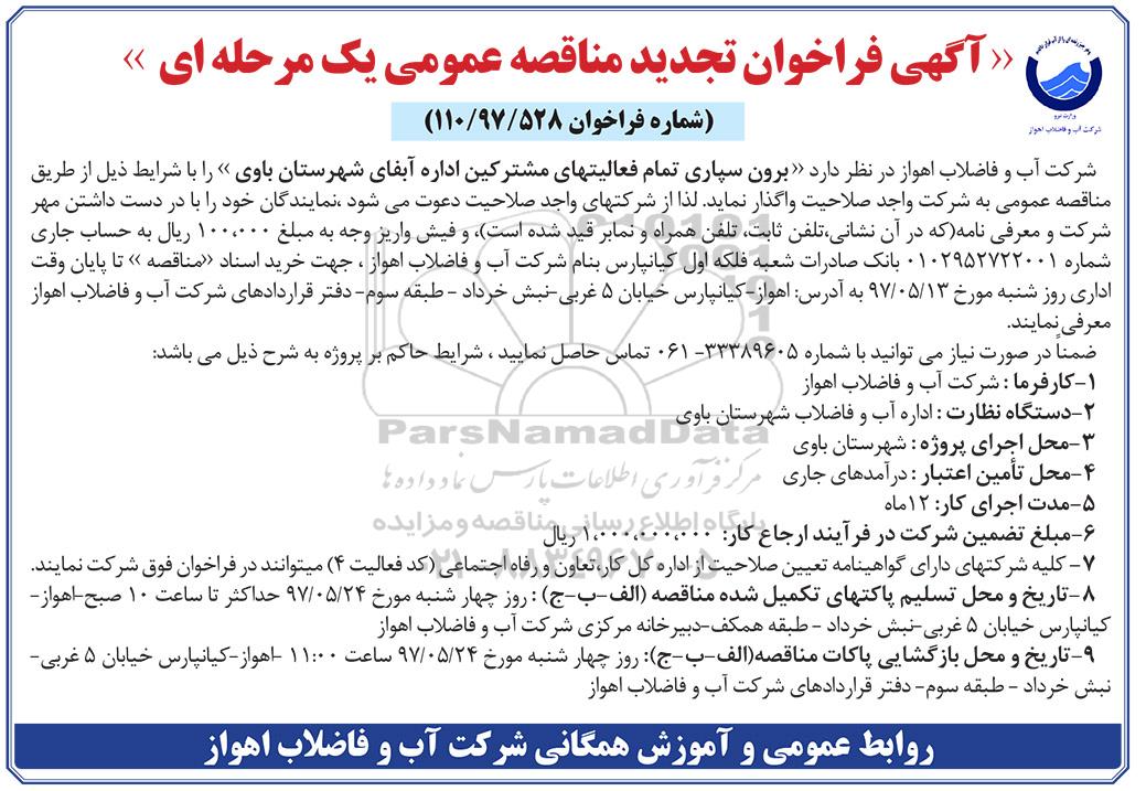 شرکت آب و فاضلاب اهواز در نظر دارد برون سپاری تمام فعالیتهای مشترکین اداره آبفای شهرستان باوی را با شرایط ذیل از طریق مناقصه عمومی به شرکت واجد صلاحیت واگذار نماید. لذا از شرکتهای واجد صلاحیت دعوت می شود نمایندگان خود را با در دست داشتن مهر شرکت و معرفی نامه (که در آن نشانی، تلفن ثابت، تلفن همراه و نمابر قید شده است)، اصل و تصویر گواهینامه صلاحیت پیمانکاری و فیش واریز به مبلغ 100.000 ریال به حساب جاری شماره 0102952722001 بانک صادرات شعبه فلکه اول کیانپارس بنام شرکت آب و فاضلاب اهواز جهت خرید اسناد مناقصه تا پایان وقت اداری روز شنبه مورخ 97.5.13 به اهواز ، کیانپارس خیابان 5 غربی ، نبش خرداد - طبقه سوم -دفتر قراردادهای شرکت آب و فاضلاب اهواز معرفی نمایند