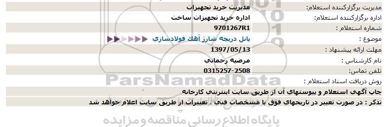 استعلام بها و موضوع استعلام استعلام پانل دریچه شارژ آهک فولادسازی به اطلاع کلیه شرکتها و افراد متخصص واجد شرایط میرساند، آگهی گذار در نظر دارد از طریق استعلام بها، نسبت به انتخاب و دریافت پیشنهادات اقدام نماید. این استعلام با کد آگهی ثبت شده در سامانه خبرگزاری پارس نماد : 1242046 منتشر شده است. مشخصات استعلام : تاریخ شروع استعلام: 1397/05/06 آخرین مهلت ارسال پیشنهاد قیمت : 1397/05/13 و محل اجرای پروژه : استان اصفهان میباشد. استعلام قیمت مورد درخواست : استعلام پانل دریچه شارژ آهک فولادسازی با دستهبندیهای تخصصی و گروه های مرتبط : دریچه و کانال هوا, ساخت،نصب و تعمیرات صنایع فولاد, تجهیزات و ماشین آلات صنعتی, استعلام اطلاع رسانی میگردد.