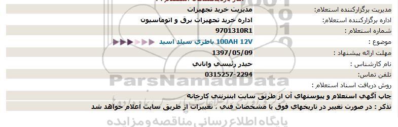 استعلام بها و موضوع استعلام استعلام باطری سیلد اسید به اطلاع کلیه شرکتها و افراد متخصص واجد شرایط میرساند، آگهی گذار در نظر دارد از طریق استعلام بها، نسبت به انتخاب و دریافت پیشنهادات اقدام نماید. این استعلام با کد آگهی ثبت شده در سامانه خبرگزاری پارس نماد : 1242054 منتشر شده است. مشخصات استعلام : تاریخ شروع استعلام: 1397/05/06 آخرین مهلت ارسال پیشنهاد قیمت : 1397/05/09 و محل اجرای پروژه : استان اصفهان میباشد. استعلام قیمت مورد درخواست : استعلام باطری سیلد اسید با دستهبندیهای تخصصی و گروه های مرتبط : منابع تغذیه, تجهیزات برق و الکترونیک, استعلام اطلاع رسانی میگردد.
