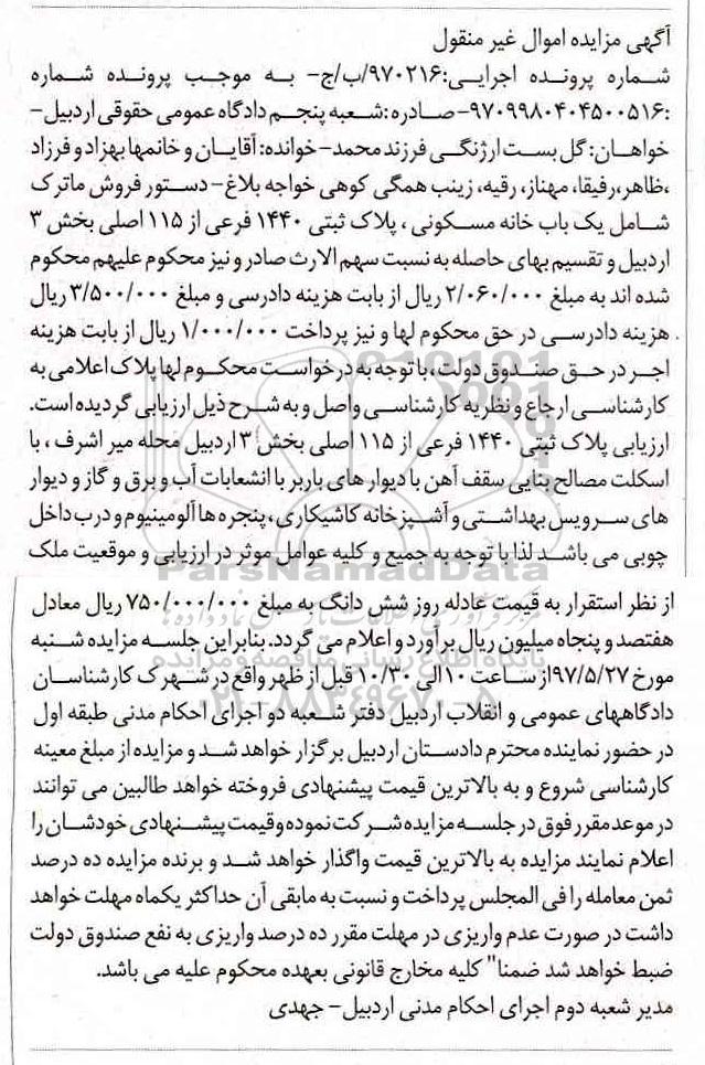مزایده خانه مسکونی پلاک ثبتی 1440 فرعی بخش سه اردبیل کلاسه 970216