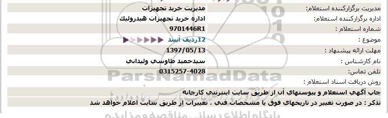 اداره برگزارکننده استعلام: اداره خرید تجهیزات هیدرولیک