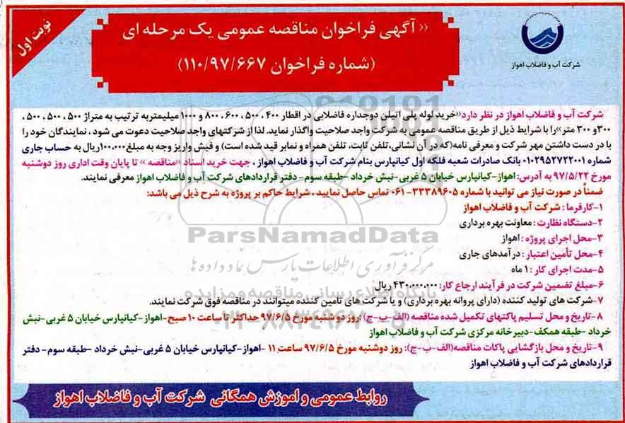 مناقصه خرید لوله پلی اتیلن دوجداره فاضلابی, آگهی فراخوان مناقصه عمومی, مناقصه خرید لوله پلی اتیلن دوجداره فاضلابی