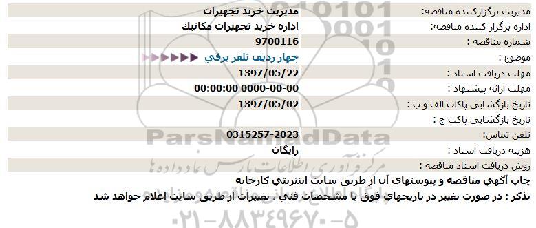 مناقصه چهار ردیف تلفر برقی از کلیه افراد متخصص و شرکتها واجد شرایط دعوت به عمل میآید در مناقصه با کد خبرگزاری پارس نماد: 1253407 شرکت نمایند.