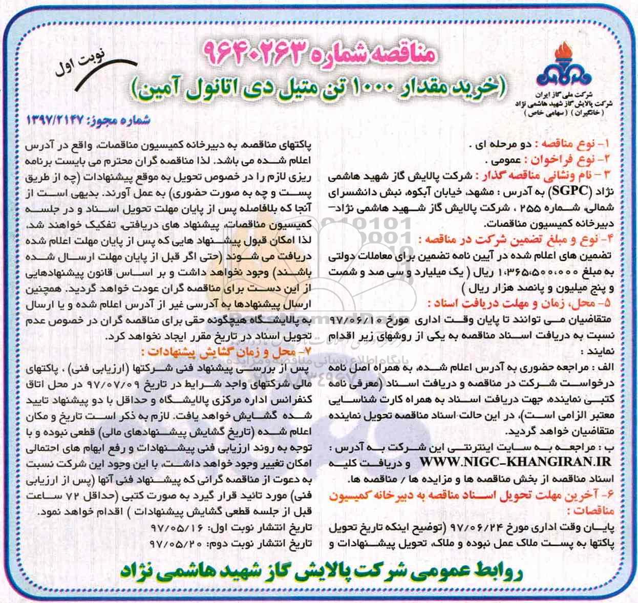 7- محل و زمان گشایش پیشنهادات: پس از بررسی پیشنهاد فنی شرکت ها ارزیابی فنی پاکتهای مالی شرکت های واجد شرایط در تاریخ 97.07.09 در محل اتاق کنفرانس اداره مشهد دفتر آبکوه به آدرس مشهد خیابان آبکوه نبش دانشسرای شمالی شماره 255 شرکت پالایش گاز شهید هاشمی نژاد و حداقل با دو پیشنهاد تایید شده گشایش خواهد یافت لازم به ذکر است تا تاریخ و مکان اعلام شده تاریخ گشایش پیشنهادهای مالی قطعی نبوده و با توجه به روند ارزیابی فنی پیشنهادات و رفع ابهام های احتمالی امکان تغییر وجود خواهد داشت با این وجود این شرکت نسبت به دعوت از مناقصه گرانی که پیشنهاد فنی آنها پس از ارزیابی فنی مورد تایید قرار گیرد به صورت کتبی حداقل 72 ساعت قبل از جلسه قطعی گشایش پیشنهادات اقدام خواهد نمود