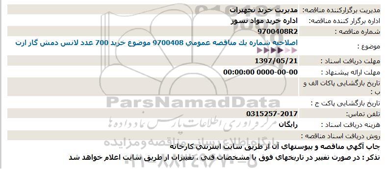 موضوع: اصلاحیه شماره یک مناقصه عمومی 9700408  خرید 700 عدد لانس دمش گاز ازت