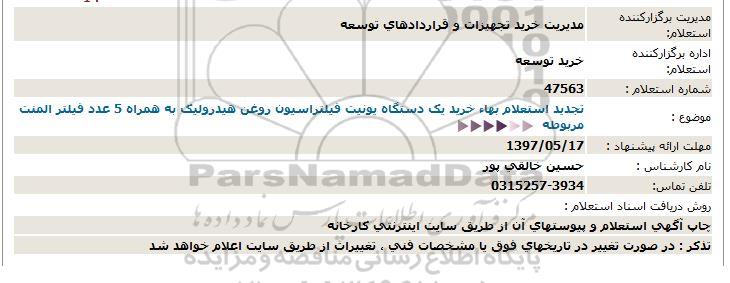 موضوع : تجدید استعلام بهاء خرید یک دستگاه یونیت فیلتراسیون روغن هیدرولیک بههمراه 5 عدد فیلتر المنت