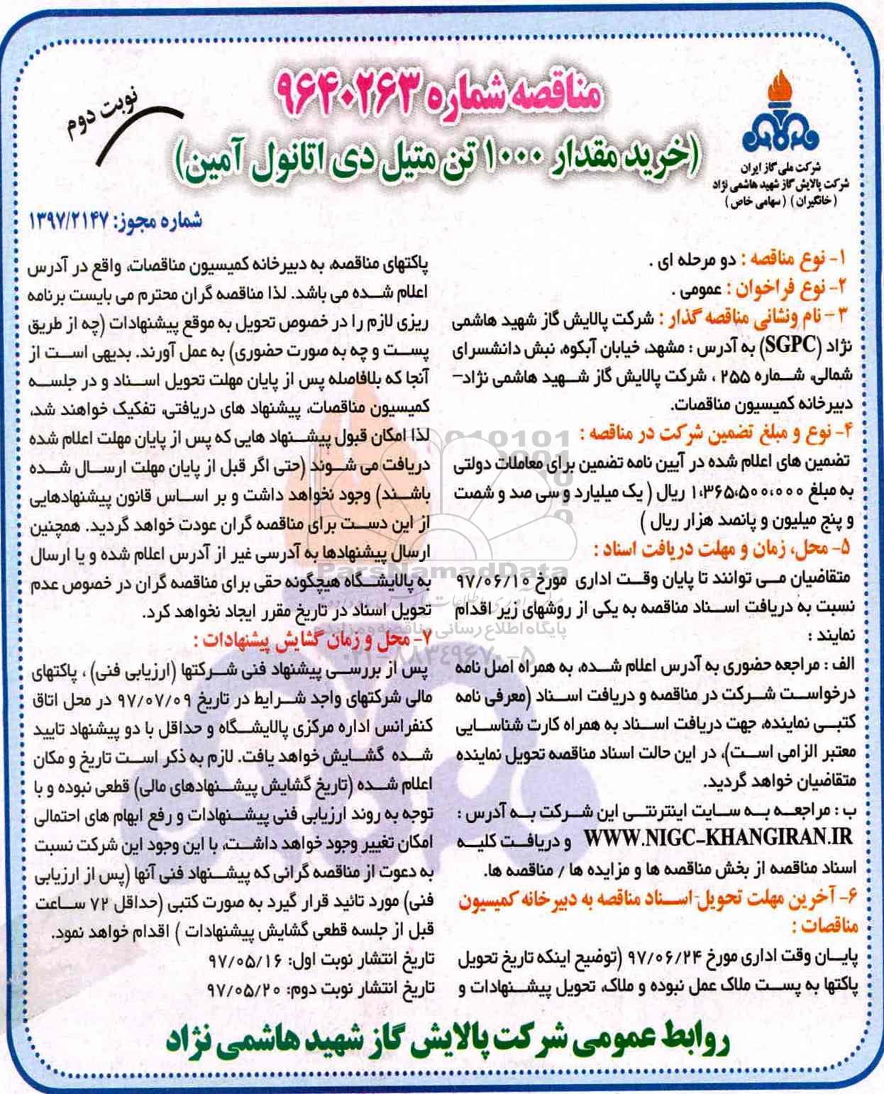 مناقصه خرید مقدار 1000 تن متیل دی اتانول آمین ـ نوبت دوم از کلیه افراد متخصص و شرکتها واجد شرایط دعوت به عمل میآید در مناقصه با کد خبرگزاری پارس نماد: 1257520 شرکت نمایند.
