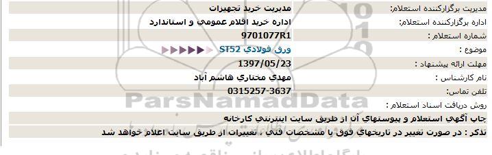 استعلام بها و موضوع استعلام استعلام , استعلام ورق فولادی ST52 به اطلاع کلیه شرکتها و افراد متخصص واجد شرایط میرساند، آگهی گذار در نظر دارد از طریق استعلام بها، نسبت به انتخاب و دریافت پیشنهادات اقدام نماید. این استعلام با کد آگهی ثبت شده در سامانه خبرگزاری پارس نماد : 1260025 منتشر شده است. مشخصات استعلام : تاریخ شروع استعلام: 1397/05/21 آخرین مهلت ارسال پیشنهاد قیمت : 1397/05/23 و محل اجرای پروژه : استان اصفهان میباشد. استعلام قیمت مورد درخواست : استعلام , استعلام ورق فولادی ST52 با دستهبندیهای تخصصی و گروه های مرتبط : آهن آلات, انواع ورق, استعلام اطلاع رسانی میگردد.