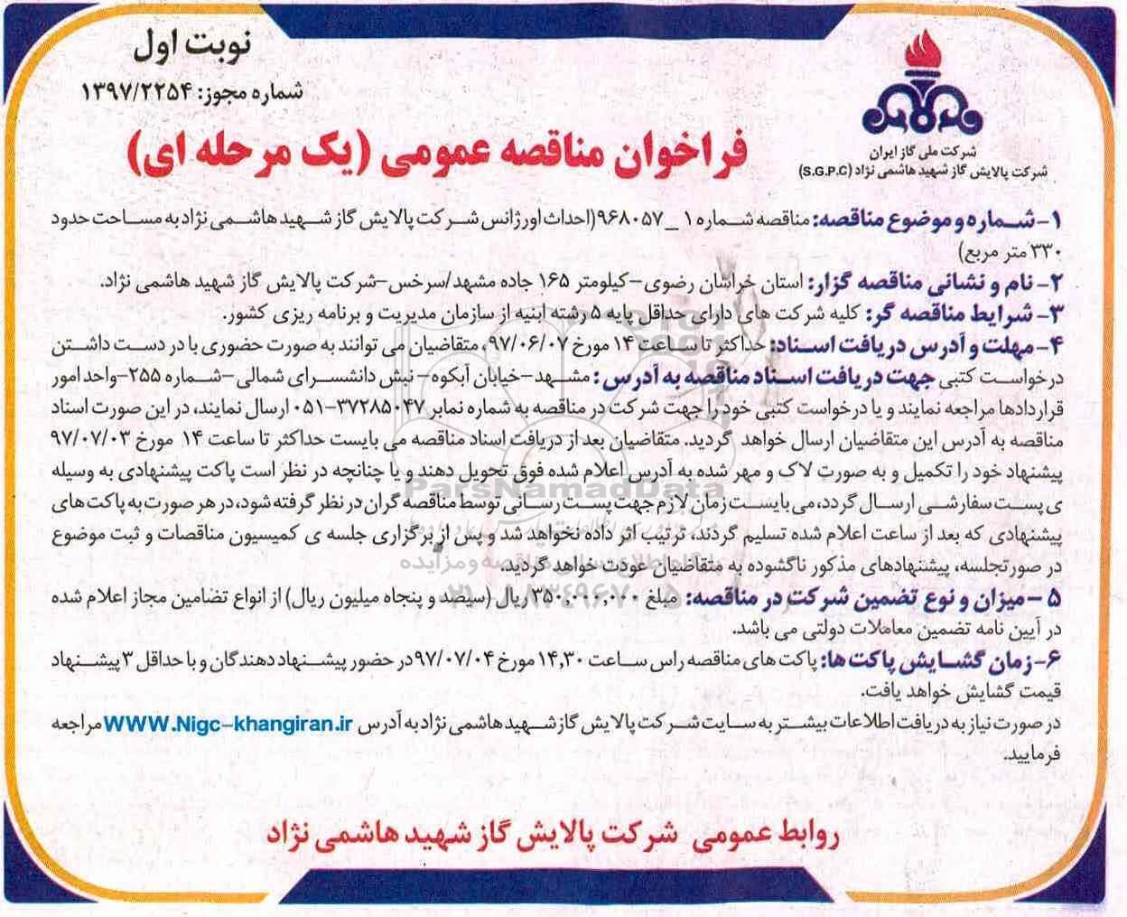 1. شماره و موضوع مناقصه: مناقصه شماره 968057-1 (احداث اورژانس شرکت پالایش گاز شهید هاشمی نژاد به مساحت حدود 330 مترمربع)