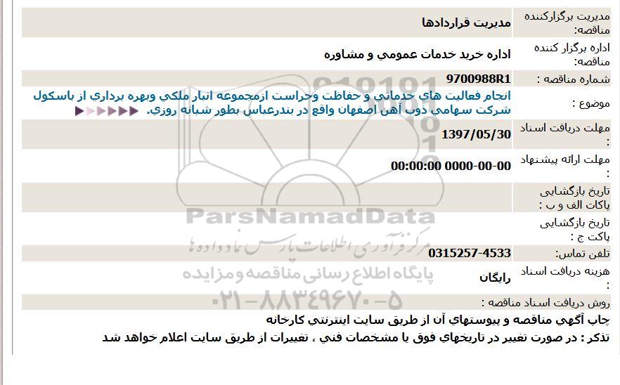 موضوع : انجام فعالیتهای خدماتی و حفاظت و حراست از مجموعه انبار ملکی و بهره برداری از باسکول شرکت سهامی ذوب آهن اصفهان واقع در بندرعباس بطور شبانه روزی