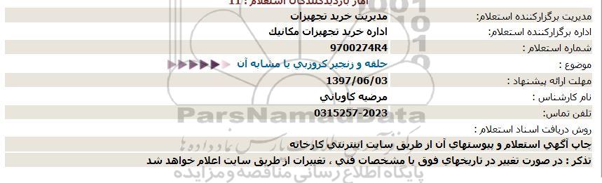 استعلام بها و موضوع استعلام استعلام, استعلام حلقه و زنجیر کروزبی یا مشابه آن به اطلاع کلیه شرکتها و افراد متخصص واجد شرایط میرساند، آگهی گذار در نظر دارد از طریق استعلام بها، نسبت به انتخاب و دریافت پیشنهادات اقدام نماید. این استعلام با کد آگهی ثبت شده در سامانه خبرگزاری پارس نماد : 1265058 منتشر شده است. مشخصات استعلام : تاریخ شروع استعلام: 1397/05/24 آخرین مهلت ارسال پیشنهاد قیمت : 1397/06/03 و محل اجرای پروژه : استان اصفهان میباشد. استعلام قیمت مورد درخواست : استعلام, استعلام حلقه و زنجیر کروزبی یا مشابه آن با دستهبندیهای تخصصی و گروه های مرتبط : زنجیر صنعتی, استعلام اطلاع رسانی میگردد.
