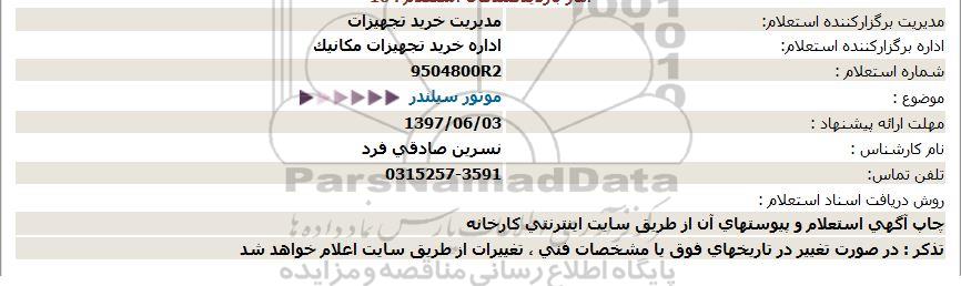 استعلام بها و موضوع استعلام استعلام موتور سیلندر به اطلاع کلیه شرکتها و افراد متخصص واجد شرایط میرساند، آگهی گذار در نظر دارد از طریق استعلام بها، نسبت به انتخاب و دریافت پیشنهادات اقدام نماید. این استعلام با کد آگهی ثبت شده در سامانه خبرگزاری پارس نماد : 1265772 منتشر شده است. مشخصات استعلام : تاریخ شروع استعلام: 1397/05/25 آخرین مهلت ارسال پیشنهاد قیمت : 1397/06/03 و محل اجرای پروژه : استان اصفهان میباشد. استعلام قیمت مورد درخواست : استعلام موتور سیلندر با دستهبندیهای تخصصی و گروه های مرتبط : تجهیزات و ماشین آلات صنعتی, استعلام اطلاع رسانی میگردد.
