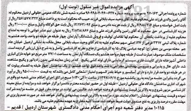 مزایده ششدانگ آپارتمان مساحت 77.01متر نوبت اول کلاسه 970163