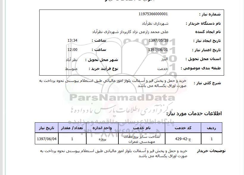 شرح کلی نیاز خرید و حمل و پخش قیر و آسفالت بلوار امور مالیاتی طبق استعلام پیوستی نحوه پرداخت به صورت اوراق یکساله می باشد