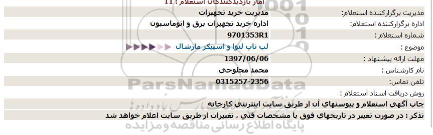 استعلام بها و موضوع استعلام استعلام , استعلام لپ تاپ لنوا و اسپیکر مارشال به اطلاع کلیه شرکتها و افراد متخصص واجد شرایط میرساند، آگهی گذار در نظر دارد از طریق استعلام بها، نسبت به انتخاب و دریافت پیشنهادات اقدام نماید. این استعلام با کد آگهی ثبت شده در سامانه خبرگزاری پارس نماد : 1270797 منتشر شده است. مشخصات استعلام : تاریخ شروع استعلام: 1397/05/29 آخرین مهلت ارسال پیشنهاد قیمت : 1397/06/06 و محل اجرای پروژه : استان اصفهان میباشد. استعلام قیمت مورد درخواست : استعلام , استعلام لپ تاپ لنوا و اسپیکر مارشال با دستهبندیهای تخصصی و گروه های مرتبط : صوت و تصویر - وسایل عکاسی و دیتا پرژکتور, کامپیوتر, نوت بوک, استعلام اطلاع رسانی میگردد.