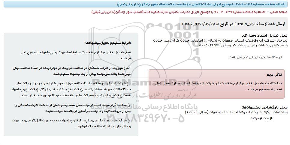 اصلاحیه مناقصه اجرای عملیات تکمیلی سازه تصفیه خانه فاضلاب ..., مناقصه ، اصلاحیه مناقصه اجرای عملیات تکمیلی سازه تصفیه خانه فاضلاب ...