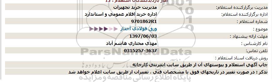 استعلام بها و موضوع استعلام استعلام, استعلام ورق فولادی آجدار به اطلاع کلیه شرکتها و افراد متخصص واجد شرایط میرساند، آگهی گذار در نظر دارد از طریق استعلام بها، نسبت به انتخاب و دریافت پیشنهادات اقدام نماید. این استعلام با کد آگهی ثبت شده در سامانه خبرگزاری پارس نماد : 1272461 منتشر شده است. مشخصات استعلام : تاریخ شروع استعلام: 1397/05/30 آخرین مهلت ارسال پیشنهاد قیمت : 1397/06/03 و محل اجرای پروژه : استان اصفهان میباشد. استعلام قیمت مورد درخواست : استعلام, استعلام ورق فولادی آجدار با دستهبندیهای تخصصی و گروه های مرتبط : آهن آلات, انواع ورق, استعلام اطلاع رسانی میگردد.