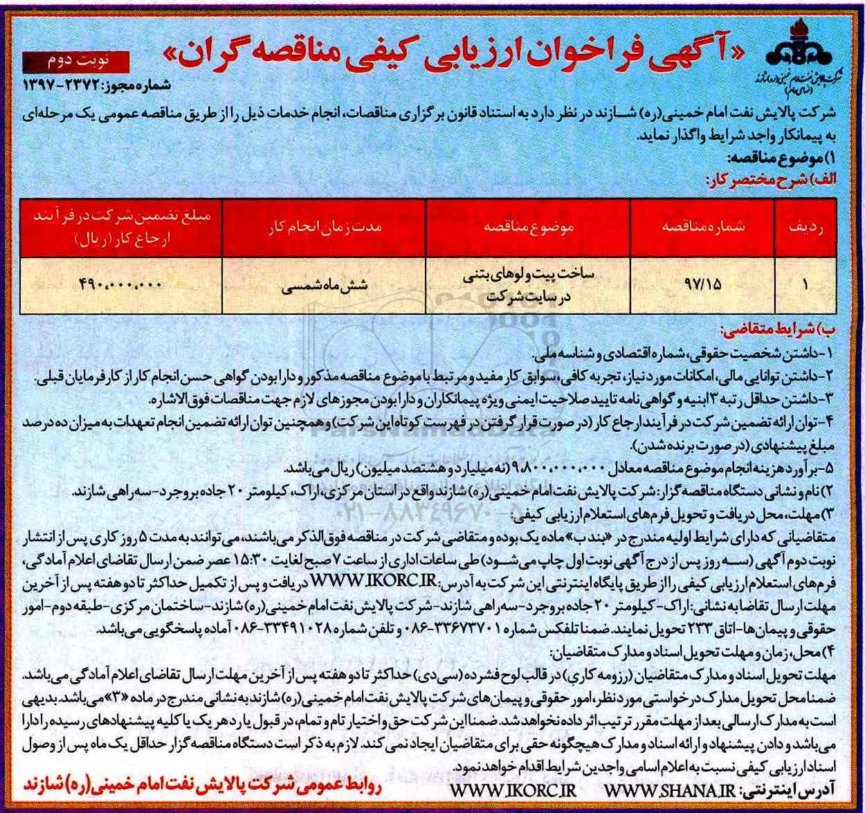 مناقصه ساخت پیت ولوهای بتنی نوبت دوم , آگهی فراخوان ارزیابی کیفی, مناقصه ساخت پیت ولوهای بتنی نوبت دوم