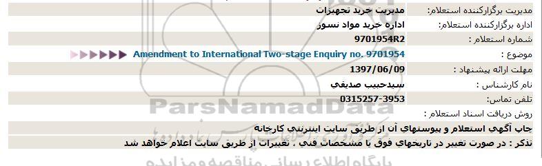 موضوع : AMENDMENT TO INTERNATIONAL TWO -STAGE ENQUIRY NO 9701954