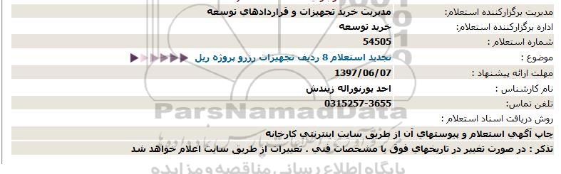 موضوع : استعلام تجدید استعلام 8 ردیف تجهیزات رزرو و پروژه ریل