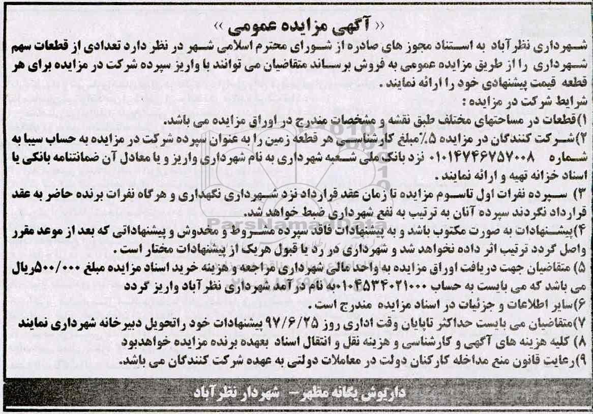 شهرداری نظرآباد به استناد مجوزهای صادر از شورای محترم اسلامی شهر در نظر دارد تعدادی از قطعات سهم شهرداری را از طریق مزایده عمومی به فروش برساند متقاضیان می توانند با واریز سپرده شرکت در مزایده برای هر قطعه قیمت پیشنهادی خود را اراده نماید.