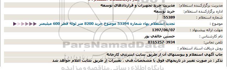 موضوع : تجدید استعلام بهاء شماره 53394 موضوع خرید 8200 متر لوله قطر 600 میلیمتر