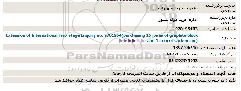 موضوع :     Extension of International Two-stage Enquiry no. 9701954(purchasing 15 items of graphite block and 1 item of carbon mix)