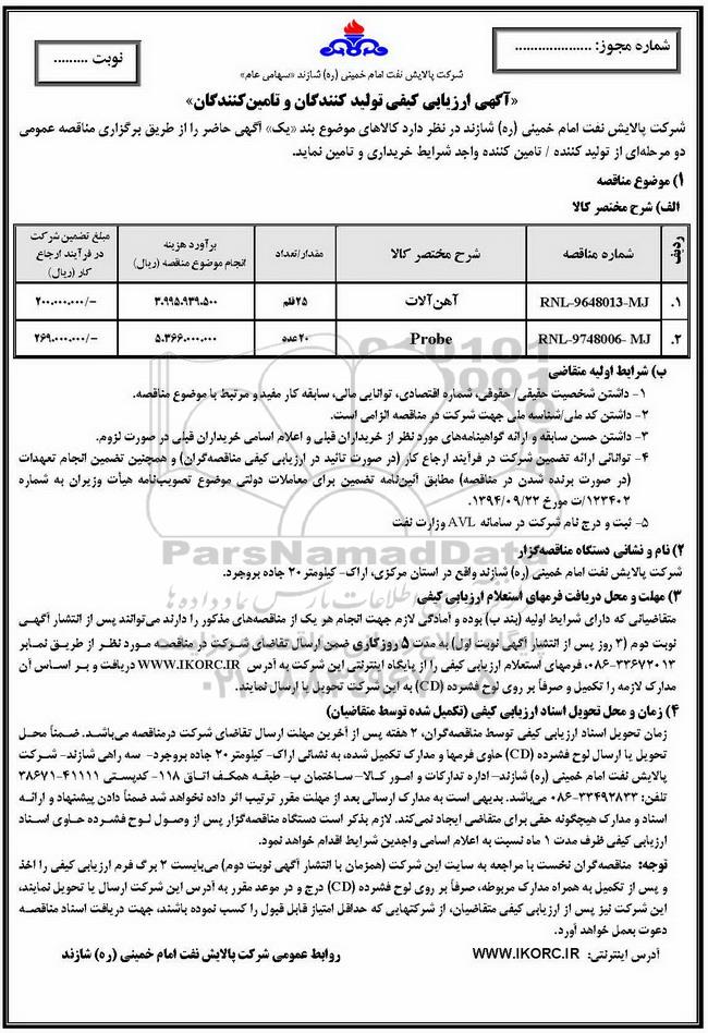مناقصه آهن آلات، PROBE, آگهی ارزیابی تولید کنندگان و تامین کنندگان, مناقصه آهن آلات، PROBE
