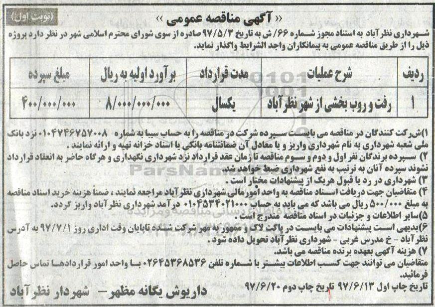 شهرداری نظرآباد به استناد مجوز شماره 66/ش به تاریخ 97.5.3 صادره از سوی شورای محترم اسلامی شهر در نظر دارد پروژه ذیل را از طریق مناقصه عمومی به پیمانکاران واجد الشرایط واگذار نماید