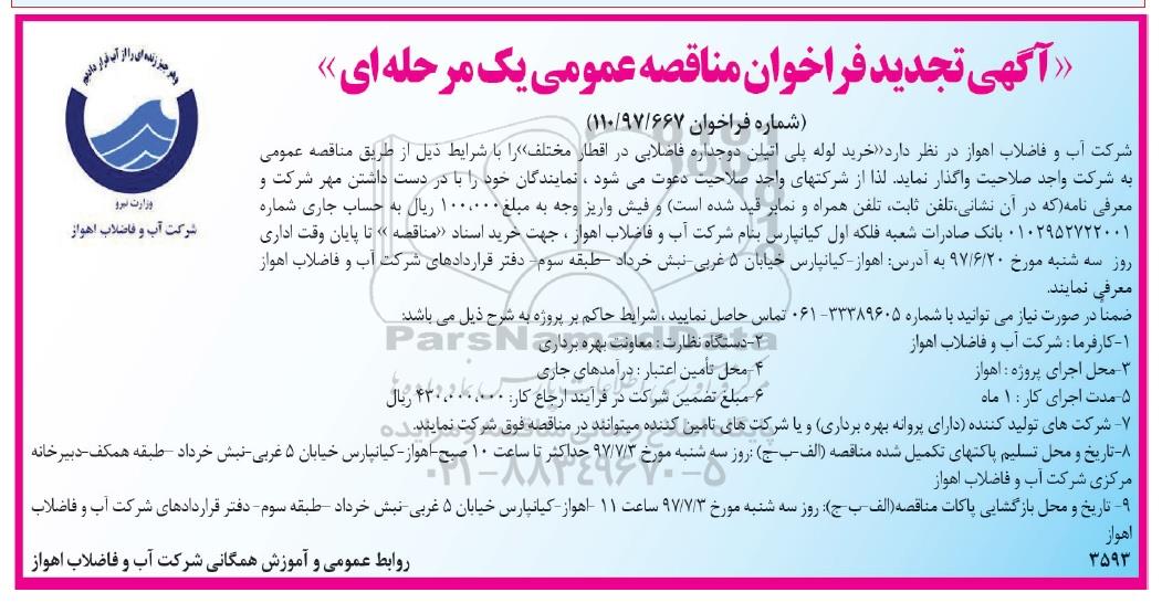 شرکت آب و فاضلاب اهواز در نظر دارد خرید لوله پلی اتیلن دوجداره فاضلابی در اقطار مختلف را با شرایط ذیل از طریق مناقصه عمومی به شرکت واجد صلاحیت واگذار نماید. لذا از شرکتهای واجد صلاحیت دعوت می شود نمایندگان خود را با در دست داشتن مهر شرکت و معرفی نامه (که در آن نشانی، تلفن ثابت، تلفن همراه و نمابر قید شده است) و فیش واریز وجه به مبلغ 100.000 ریال به حساب جاری شماره 0102952722001 بانک صادرات شعبه فلکه اول کیانپارس به نام شرکت آب و فاضلاب اهواز جهت خرید اسناد مناقصه تا پایان وقت اداری روز سه شنبه مورخ 97.6.20 به آدرس اهواز - کیانپارس خیابان 5 غربی - نبش خرداد - طبقه سوم - دفتر قراردادهای شرکت آب و فاضلاب اهواز معرفی نمایند.