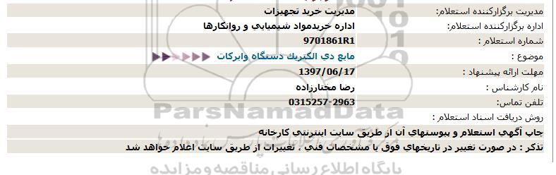 اداره برگزارکننده استعلام: اداره خرید مواد شیمیایی و روانکارها