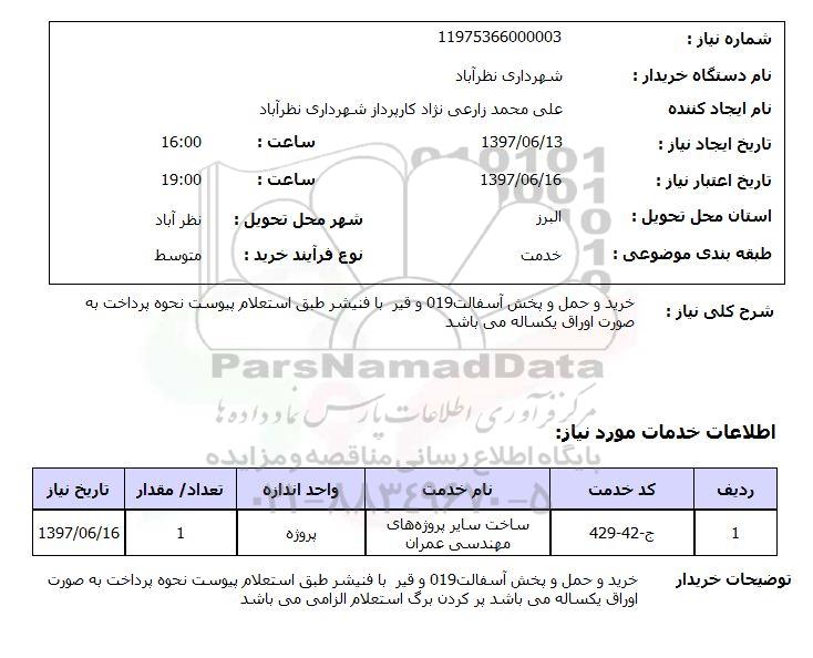 شرح کلی نیاز: خرید و حمل و پخش آسفالت 019 و قیر با فنیشر طبق استعلام پیوست نحوه پرداخت به صورت اوراق یکساله می باشد