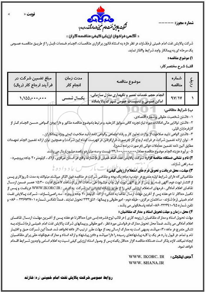 | 97/17 | انجام حجم خدمات تعمیر و نگهداری منازل سازمانی ، اماکن و تاسیسات عمومی شهرک پالایشگاه |
