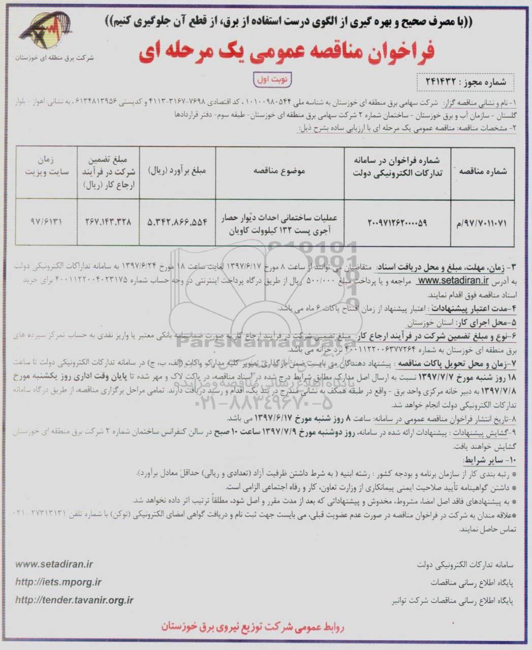 | 97/7011071/م | 200971262000059 | عملیات ساختمانی احداث دیوار حصار آجری پست 132 کیلوولت کاویان |