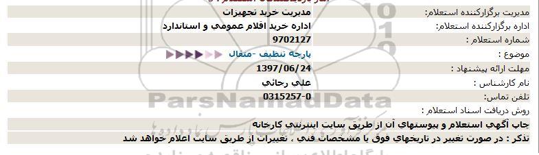استعلام بها و موضوع استعلام استعلام , استعلام پارچه تنظیف به اطلاع کلیه شرکتها و افراد متخصص واجد شرایط میرساند، آگهی گذار در نظر دارد از طریق استعلام بها، نسبت به انتخاب و دریافت پیشنهادات اقدام نماید. این استعلام با کد آگهی ثبت شده در سامانه خبرگزاری پارس نماد : 1292420 منتشر شده است. مشخصات استعلام : تاریخ شروع استعلام: 1397/06/18 آخرین مهلت ارسال پیشنهاد قیمت : 1397/06/24 و محل اجرای پروژه : استان اصفهان میباشد. استعلام قیمت مورد درخواست : استعلام , استعلام پارچه تنظیف با دستهبندیهای تخصصی و گروه های مرتبط : نخ و پارچه, لوازم بهداشتی, استعلام اطلاع رسانی میگردد.