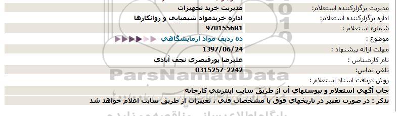 استعلام بها و موضوع استعلام استعلام، استعلام ده ردیف مواد آزمایشگاهی به اطلاع کلیه شرکتها و افراد متخصص واجد شرایط میرساند، آگهی گذار در نظر دارد از طریق استعلام بها، نسبت به انتخاب و دریافت پیشنهادات اقدام نماید. این استعلام با کد آگهی ثبت شده در سامانه خبرگزاری پارس نماد : 1292462 منتشر شده است. مشخصات استعلام : تاریخ شروع استعلام: 1397/06/18 آخرین مهلت ارسال پیشنهاد قیمت : 1397/06/24 و محل اجرای پروژه : استان اصفهان میباشد. استعلام قیمت مورد درخواست : استعلام، استعلام ده ردیف مواد آزمایشگاهی با دستهبندیهای تخصصی و گروه های مرتبط : خدمات و تجهیزات آزمایشگاهی و پزشکی, استعلام اطلاع رسانی میگردد.