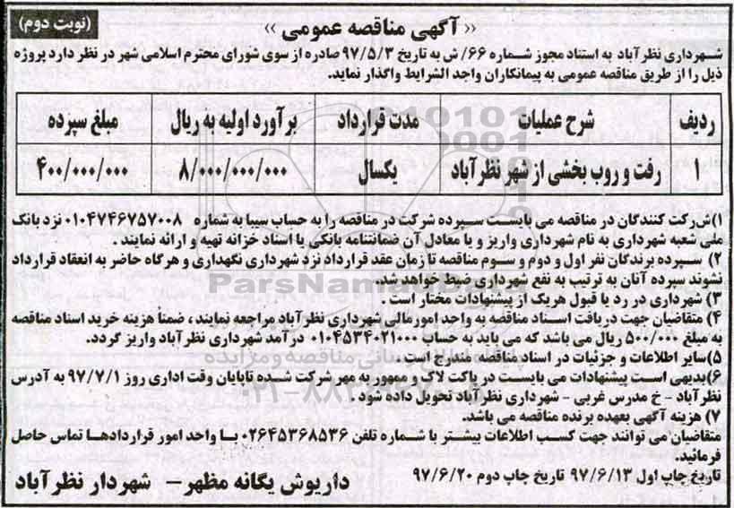 شهرداری نظرآباد به استناد مجوز شماره 66/ش به تاریخ 97.5.3 صادره از سوی شورای محترم اسلامی شهر در نظر دارد پروژه ذیل را از طریق مناقصه عمومی به پیمانکاران واجد الشرایط واگذار نماید
