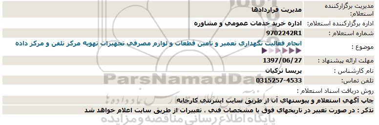 موضوع : انجام فعالیت نگهداری تعمیر و تامین قطعات و لوازم مصرفی تجهیزات تهویه مر ز تلفن و مرکز داده