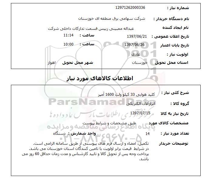 شرح کلی نیاز: کلید هوایی 33 کیلو ولت 1600 آمپر