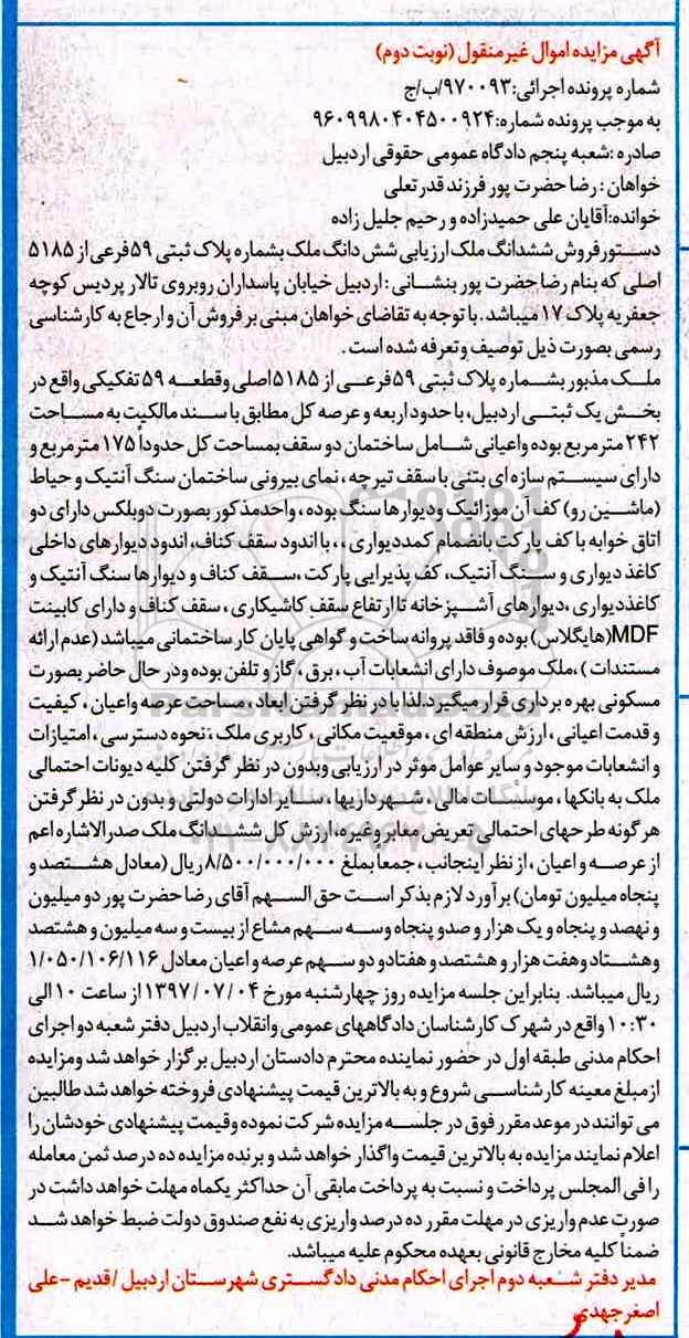 مزایده ششدانگ ملک شماره 59 فرعی از 5185 اصلی کلاسه 970093